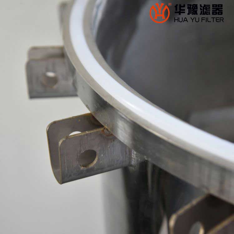 液體從上進口法蘭流入,進入濾袋內測,固體雜質顆粒在通過濾袋時,被攔截在濾網上,支撐網籃是用來支